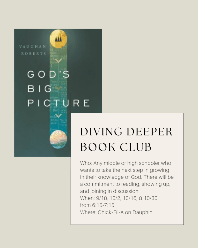 This is open to boys and girls in middle and high school. We will meet fourThursday mornings (9/18, 10/2, 10/16, & 10/30) from 6:15-7:15 at Chick-Fil-A on Dauphin. There will be a commitment of prepartion, reading, and participation. If your student is intersted in diving deeper, please email Lexi or Sonny.